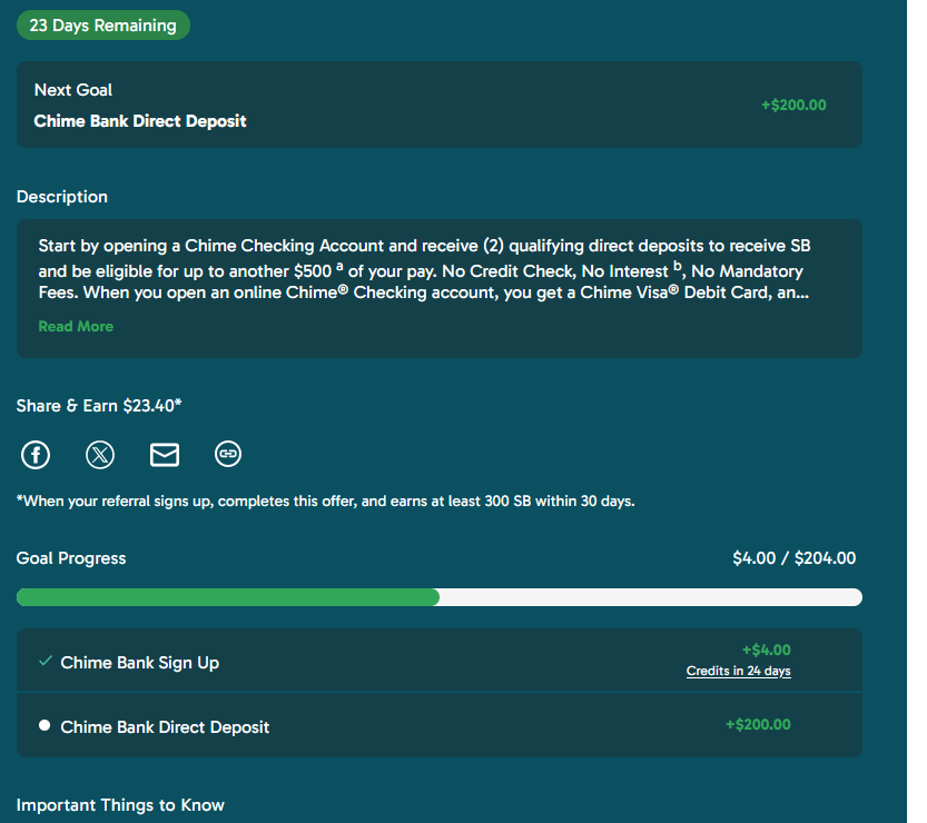 Lets talk Chime. They’re an online bank with some interesting things, virtual debt cards that have separate numbers from you physical one for online purchases, Spot me free over drafts up to a certain dollar amount, and of course a referral link. Each Friend that opens an account and makes 1 Direct Deposit of $200, then each person gets $100 into their Chime account. Crazy! Now there’s several websites that track what an acceptable direct deposit is, but payroll from work will always be acceptable, or Social Security, or VA Benefits etc. I used payroll, I’ll let the two paychecks hit get my bonus and most likely not keep it there because I’ll want to churn another banking bonus. And of course I’ll add the swagbucks link here and the personal one to the toolbox, because this is a blog about finding “free” money that makes us more money!